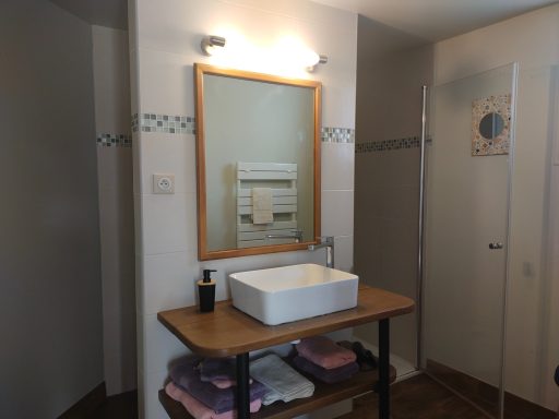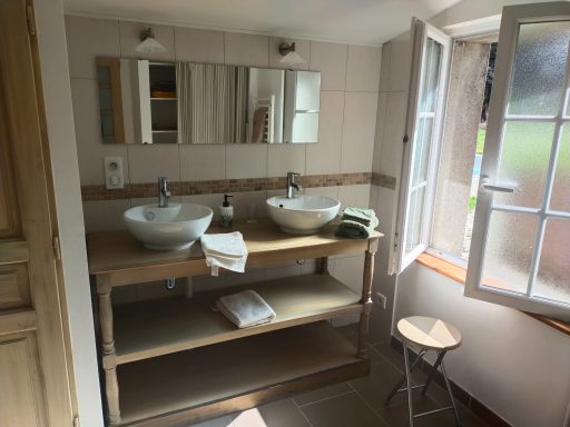 En rez-de-chaussée : une chambre avec lit double 140, deux fauteuils, console ; une salle d'eau avec douche, meuble double vasque, wc, grand placard. A l'étage, une petite chambre fermée par un rideau sur l'escalier, deux lits simples. 31 m² et davantage en sous-pente. Expositions ouest, nord et sud. Linge de lit et de toilette fourni.