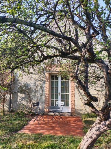Chambre de charme, baignée de lumière. En rez-de-chaussée, avec accès indépendants depuis la cour et depuis une petite terrasse privative donnant sur l'étang plein sud.